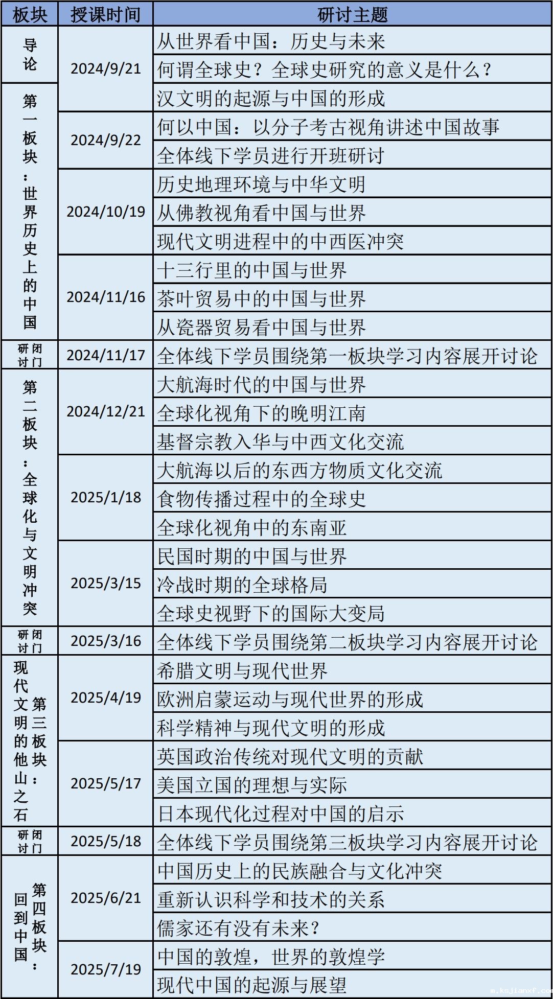 2、授课时间:2024年9月至2025年7月,每月一次线下集中授课,一般安排在该月的第三个周六(即9月21日、10月19日、11月16日等,依次类推),闭门研讨时间一般是周日,详参课表。