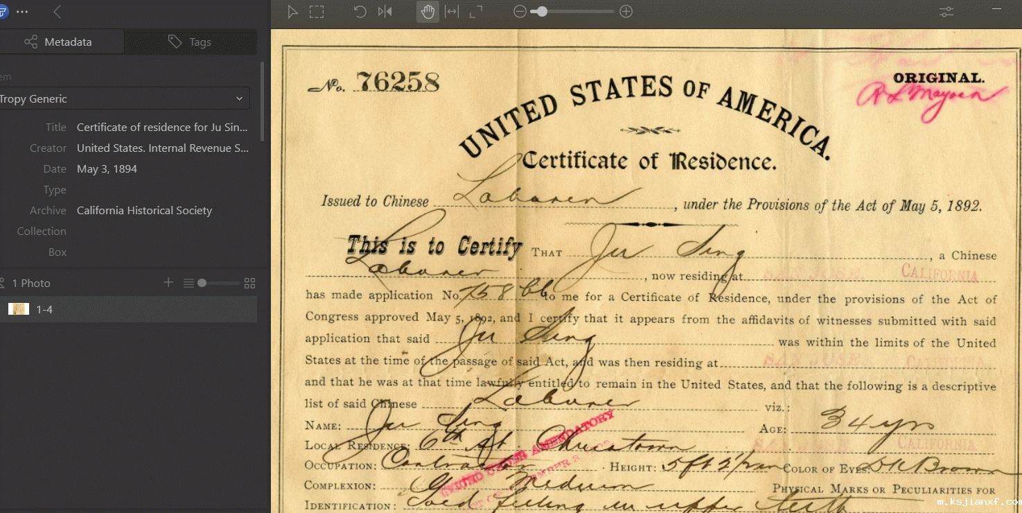 本门课程的特色是讲授与练习的并重,在了解数字人文方法的同时,学生们也能亲自尝试多种数字人文方法。Walter教授提供了数份19世纪90年代年代加利福尼亚州的中国移民居留证,同学们学会了用Tropy软件存储史料照片,并对照片进行了基本的编目,这一工作是整理档案馆大量史料照片的基础。