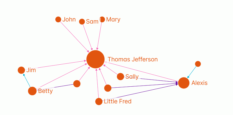 在练习环节中,同学们尝试了多种可视化工具。通过Graph Commons网站,大家制作了杰斐逊与他的部分奴隶的人物关系图表,部分同学也尝试由Flourish网站制作和标注地图。Walter进一步介绍了他在密歇根州立大学的数字人文教学实践,同学与老师们也在课余时间就各自的数字人文研究与Walter展开了交流。