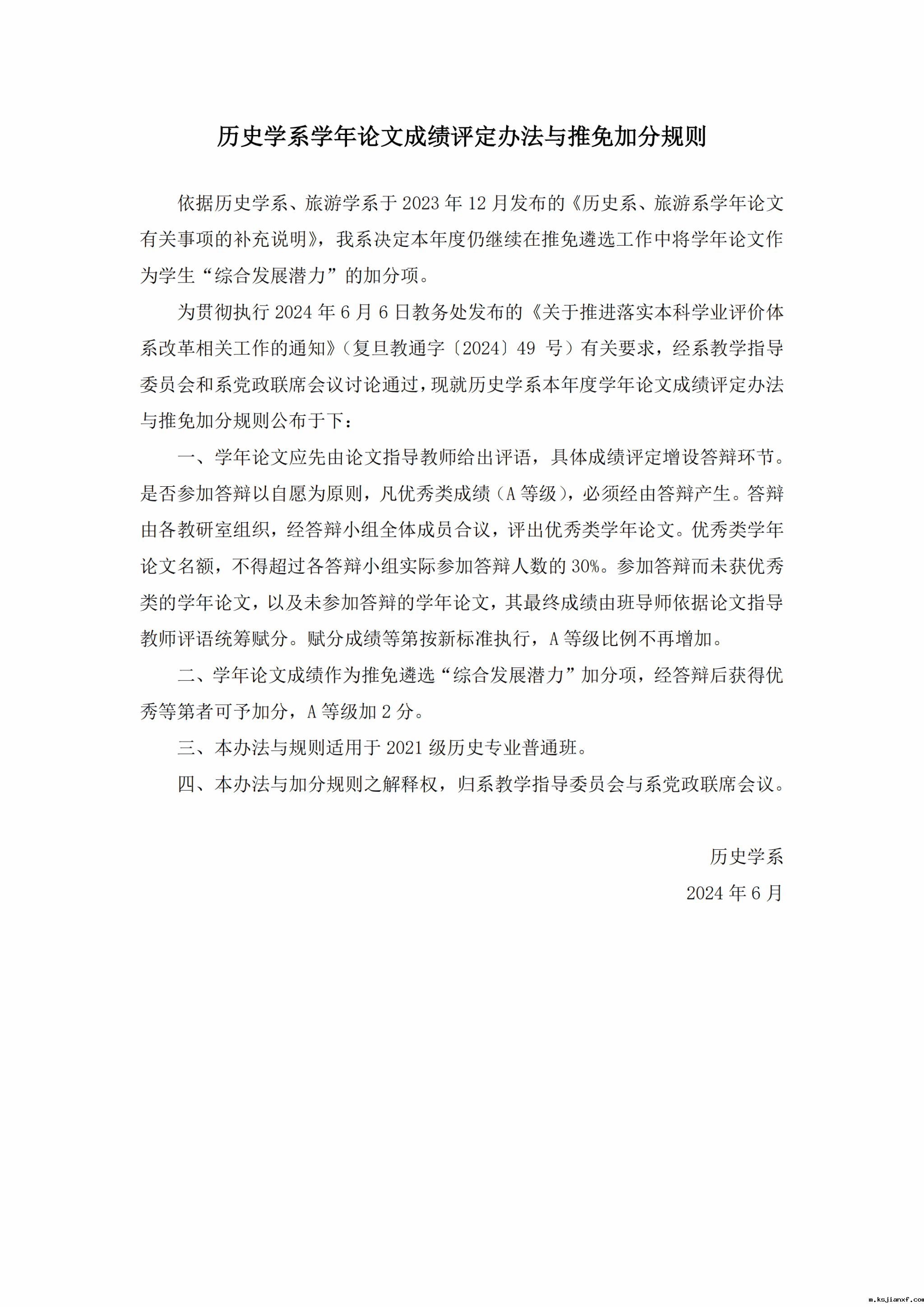 历史学系旅游学系2025年推荐优秀本科毕业生免试攻读研究生工作实施细则