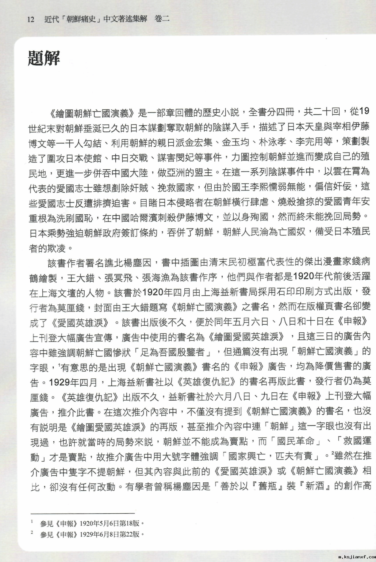 【以下节录编著者为杨尘因《绘图朝鲜亡国演义》(原书为1920年上海益新书局出版,收入本书第一卷)所作的题解】